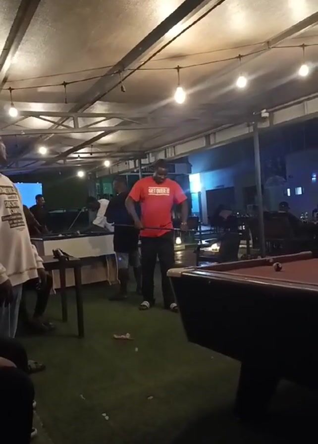 The video captures a casual indoor setting with multiple people gathered around pool tables. Artificial turf covers the floor. The space is lit by hanging light bulbs, and the ceiling has an exposed beam structure. One man, wearing a red t-shirt with the words "Get Over It" and black pants, is standing near a pool table, holding a pool cue across his back. Other men are scattered around the room, some engaged in playing pool, while others are standing or sitting. A screen showing an indistinct image is visible in the background, and there are tables and chairs set up in an area resembling a lounge or bar. An upbeat African song plays in the background.