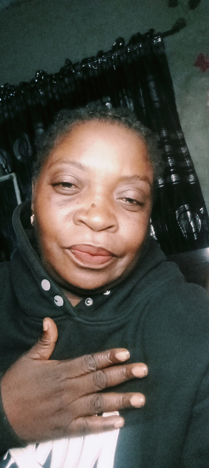 A woman with dark skin and short hair wearing a black hooded sweatshirt is the primary subject. Her hand rests on her chest. The sweatshirt has white buttons, and she wears small gold hoop earrings. Dark, shiny decorations hang behind her. The lighting is dim, contributing to a somewhat grainy quality in the image. Her lips are a muted red or brown color.