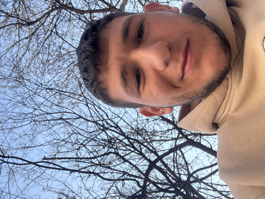 A young adult male is depicted in a low-angle, close-up outdoor portrait
