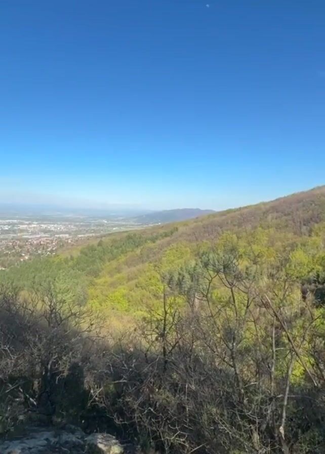 scenic view of a landscape from a high vantage point on a clear, sunny day. The sky is bright blue with a faint, high-altitude contrail visible, and a small crescent moon is visible. Below, a forested hillside slopes down towards a distant city. The trees are mostly green, indicating it is spring or early summer. In the foreground, there is rocky terrain with sparse vegetation.