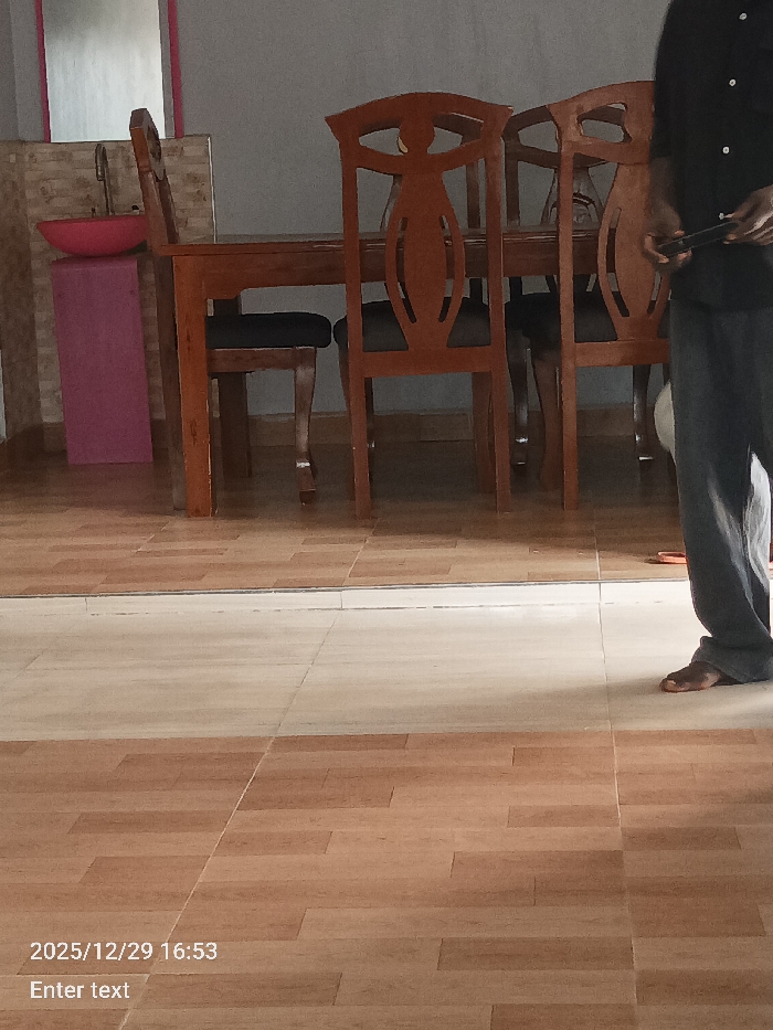 This image depicts an indoor domestic or common area in Makurdi, Nigeria, captured on 2025/12/29 at 16:53. The scene features a two-tiered tiled floor. The foreground consists of light beige-cream square tiles, separated by a thin silver-colored transition strip from the background area, which displays rectangular, wood-grain pattern tiles in shades of brown and tan. The walls are painted a solid grey. In the left background, a pink, bowl-shaped basin with a silver faucet is mounted on a dark pink rectangular pedestal or cabinet. This unit is positioned against a section of wall tiled with light-colored, possibly brick-patterned, tiles. A rectangular mirror with a thin red frame is affixed to the wall above the basin. A wooden dining table, rectangular in shape and of a medium brown tone, occupies the central background. Surrounding the table are at least four wooden dining chairs with distinctive openwork backrests featuring a central vertical slat and two curved side elements. Some chairs exhibit dark, possibly black, upholstered seat cushions. In the right foreground to mid-ground, a single individual is partially visible, framed from the mid-torso downwards. The person is wearing a dark, collared shirt with visible white buttons and loose-fitting dark grey or blue trousers. They appear barefoot; a small orange object, consistent with a slipper or sandal, is present on the floor near their right foot. The individual is standing upright, holding a dark-colored, rectangular electronic device, consistent with a mobile phone or remote control, horizontally with both hands at waist level. No other individuals or direct interactions are visible.