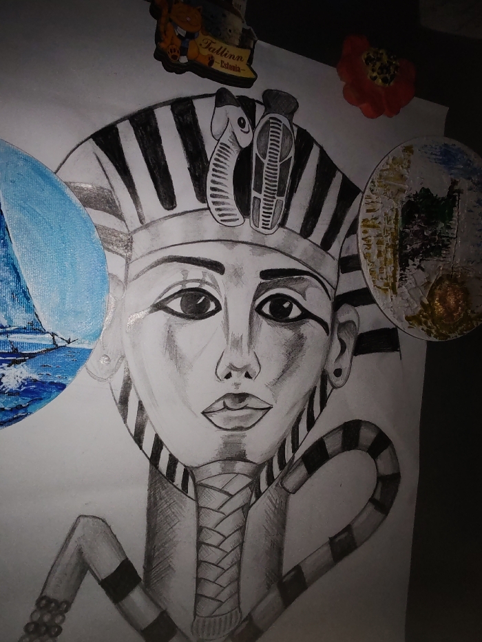 The image displays a pencil drawing of an ancient Egyptian pharaoh in grayscale, centered on a white sheet of paper