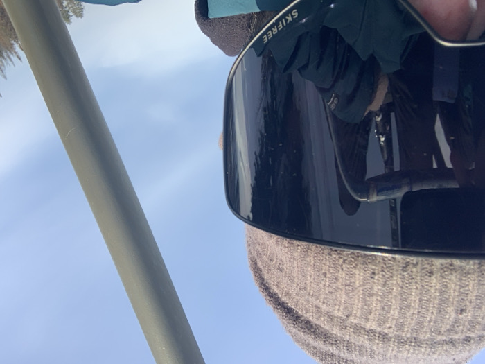 An individual, partially visible, wears a grey ribbed knit beanie, black-framed ski goggles with a dark, reflective lens, and a teal or dark blue jacket displaying "SKIFREE" on the goggle strap