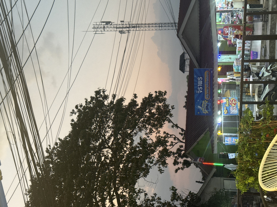 This image depicts an outdoor urban scene at dusk in Muang Pattaya, Thailand. The sky transitions from a soft orange-pink horizon on the lower left to a lighter blue-grey overhead, with sparse, thin clouds. Numerous black electrical and communication lines crisscross the upper two-thirds of the frame. On the left, a large, dense-leafed tree with dark green foliage is prominently silhouetted against the fading light. To its right, a series of low-rise commercial buildings with dark red tiled roofs are visible. The central building features a bright blue sign with Thai text reading "จิราพร" and "ร้านค้าดาว" (Jiraporn / Raan Ka Dao - Star Shop), indicating a retail establishment. This building is brightly lit from within and adorned with string lights along its facade. Displays of packaged goods, including large bags consistent with pet food, are visible through the open front. A white scooter/motorcycle is parked in front of this shop. To the left of the main shop, another building with a green facade features a vertical, illuminated red, white, and green light strip. On the far right, a tall, metal lattice telecommunications tower with multiple antennae is silhouetted against the sky. In the bottom-left foreground, a white, wicker-style chair and lush green foliage are partially visible behind a dark railing or fence, suggesting an outdoor seating area. No individuals are present or engaged in any discernible action. The overall environment appears to be a commercial street or neighborhood.