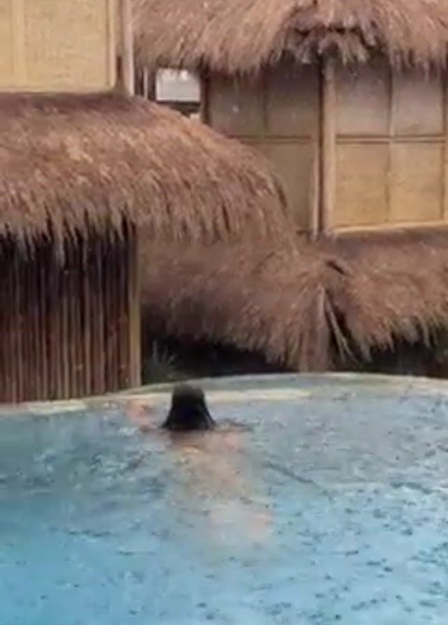 A woman in a green bikini is swimming in a turquoise swimming pool surrounded by thatch-roofed huts. It is raining. She swims to the edge of the pool and climbs out.