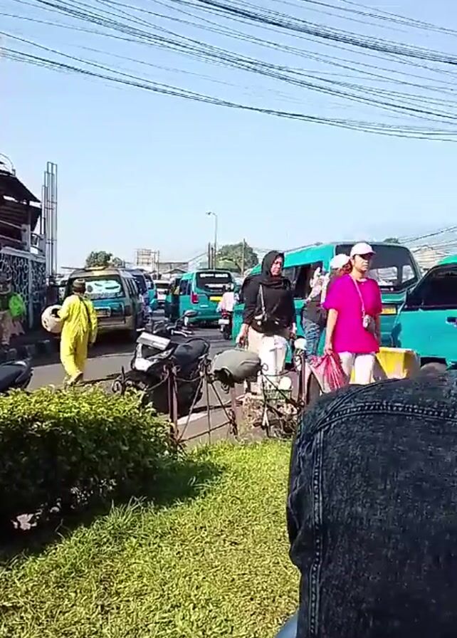 busy street scene. Several teal-colored mini-vans are parked along the roadside, and people are milling about, some carrying bags. The focus shifts to two men standing near a hedge, conversing with each other. The camera then pans across the street, showing a series of yellow traffic barriers. People are walking along the sidewalk and a black vehicle drives along the road. The environment appears to be a commercial area with shops and billboards visible in the background, under a clear blue sky.