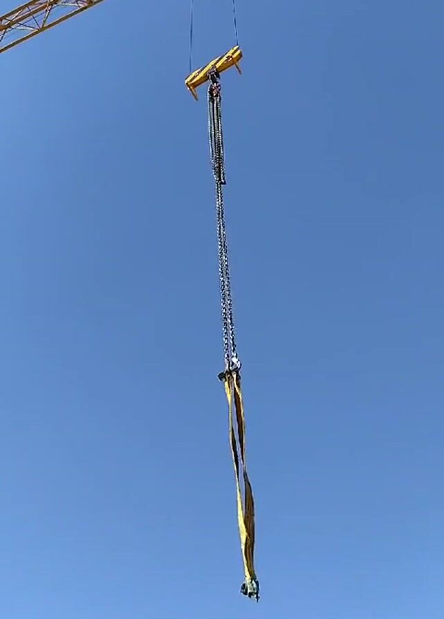 Here is a forensic description of the video: The video shows a yellow crane boom extending from the top left corner of the frame. Hanging from the boom is a yellow beam connected to a chain. A yellow strap is connected to the bottom of the chain. The camera angle changes to show a building with multiple windows under a clear blue sky.