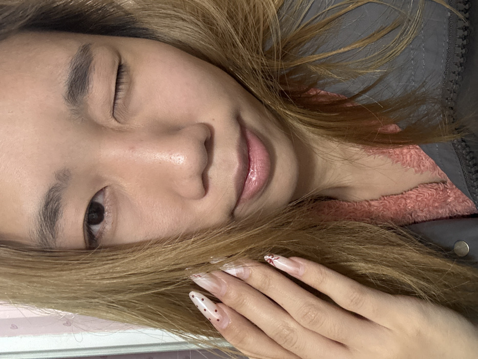An East Asian female is depicted in a close-up, head-and-shoulders portrait, likely taken indoors within Shapingba District, China. The subject has long, light brown hair, with her left eye open and her right eye closed in a wink. Her lips are slightly parted, revealing a subtle smile. Her left hand is raised to the left side of her face, with fingers slightly spread. The fingernails are long, almond-shaped, and feature decorative elements including white tips, red polka dots, and a red bow design. She is wearing a grey zippered jacket over an inner layer of pink, textured fabric. A light-colored wall with faint vertical patterns is visible in the background to the left.