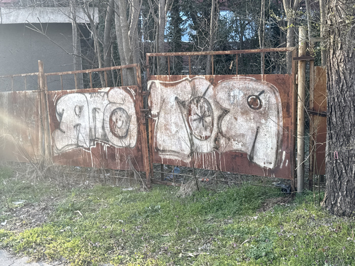 - "The image displays a two-panel, heavily rusted metal gate covered in white graffiti, located outdoors in Burgas, Bulgaria" by FM-OTqD53, licensed under CC BY 4.0