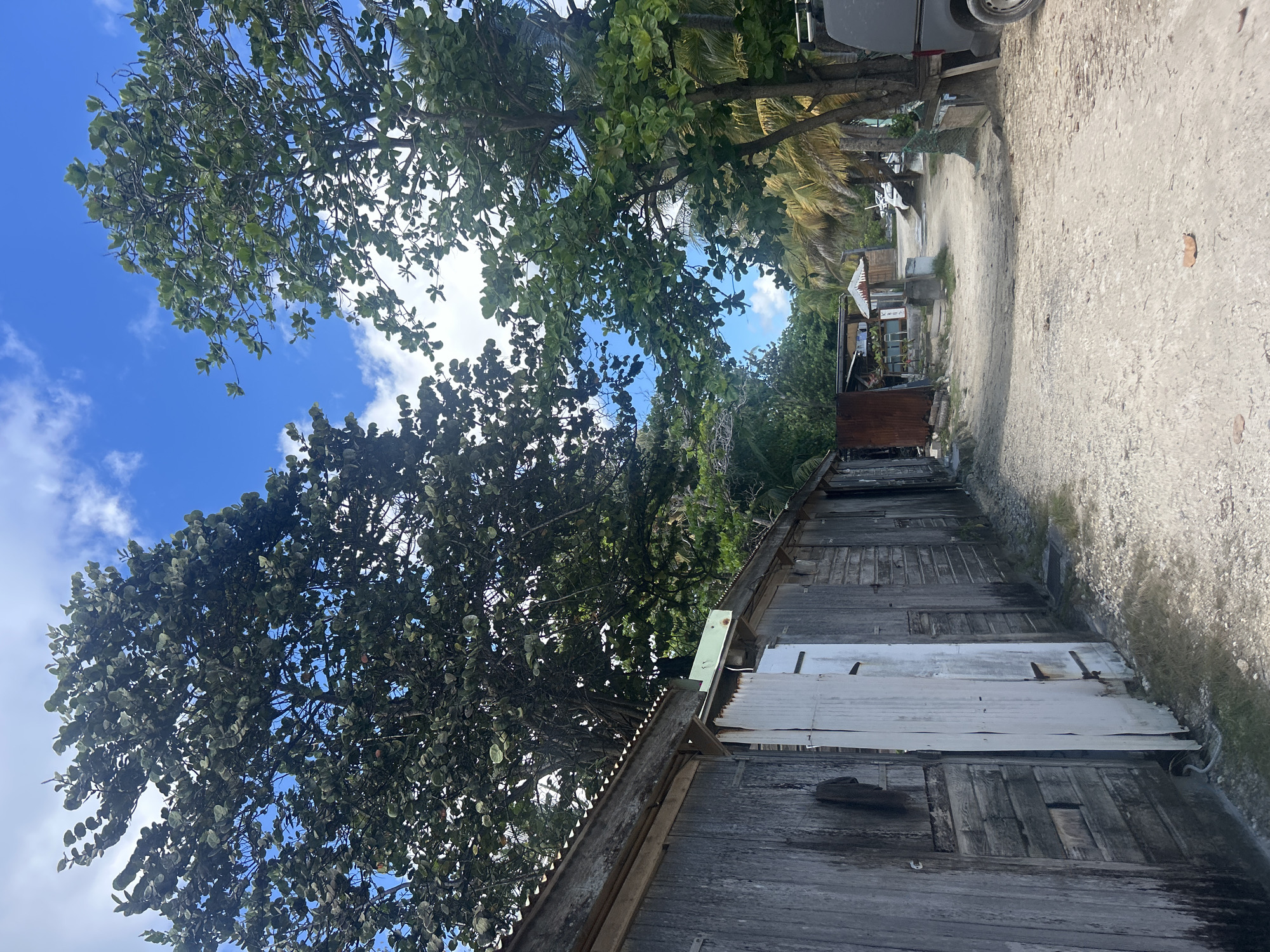 The image depicts a scene in Sainte-Anne, France. A weathered, wooden structure with a corrugated metal roof sits alongside a dirt path. Trees with dense foliage partially obscure a blue sky with scattered clouds. In the background, other structures and vegetation are visible, suggesting a populated area. A portion of a vehicle is visible along the path.