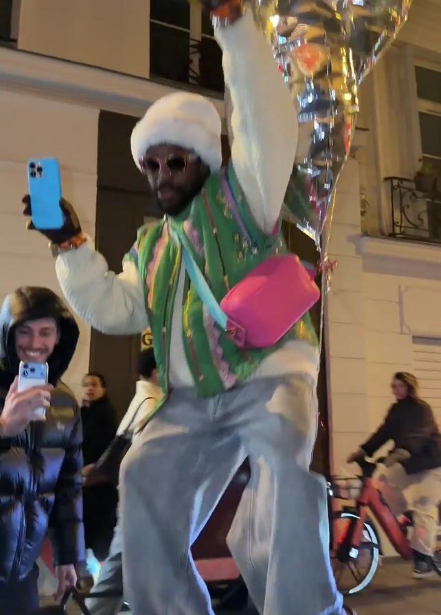 A man in a white hat, green and patterned vest, light blue jeans, and sneakers, is standing on something and dancing. He is holding a blue smartphone in his left hand and has a pink bag over his shoulder. There is a large silver balloon behind him. Another person is in the lower left corner, holding their phone up and smiling. There are people and bicycles in the background. The scene is outdoors, at night.