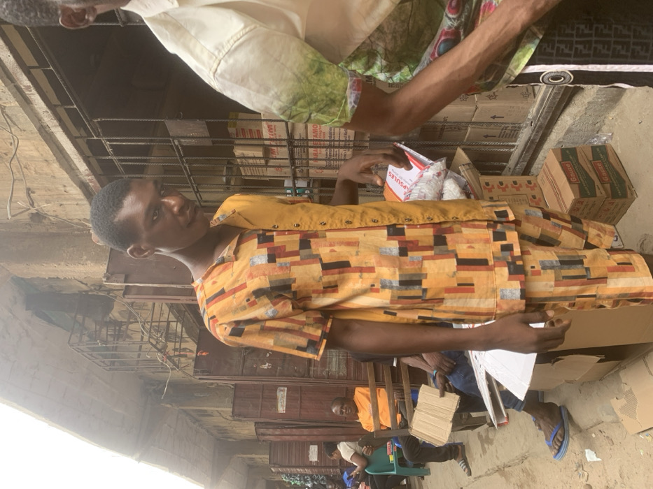 A man in a patterned shirt looks to the left while holding white items in his hand. Behind him, another person in a white shirt and patterned sleeves is present. Boxes with text on them sit nearby. Other people are visible further back, with one seated in a green chair while another is holding a piece of cardboard. The setting appears to be outdoors, near structures with metal bars and doors.