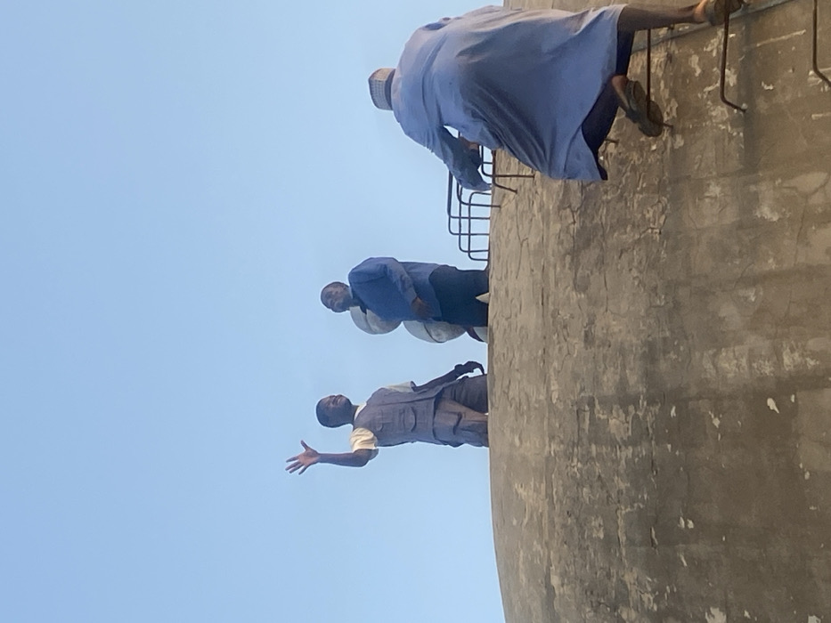 Three adult males are situated on a large, weathered, grey concrete dome-shaped structure under a clear light blue sky in Barako, Nigeria