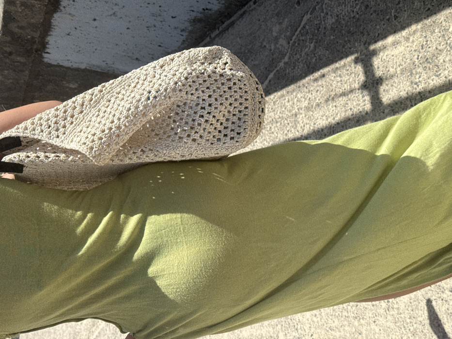 A crocheted off-white bag with black handles rests on a person's lap, covered with a light green linen dress. Sunlight casts shadows on both the bag and the dress. The background reveals a concrete surface with varying shades due to sunlight exposure. The image captures an eye-level perspective, emphasizing the textures of the fabric and crochet.