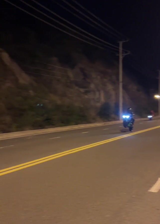 - "At night, a motorcycle travels down a road in front of a white car" by FM-1FgIL2, licensed under CC BY 4.0