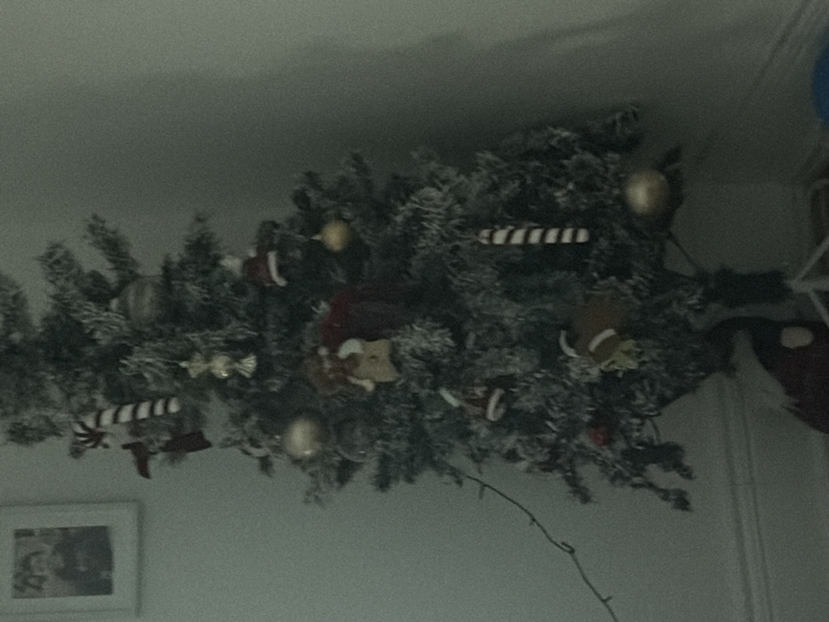 A decorated Christmas tree leans against a wall, adorned with ornaments including golden baubles, candy canes, and gingerbread men. The tree has a light dusting of artificial snow. A framed photo hangs on the wall to the left. A blue balloon and white shelving are partially visible in the upper right corner. An electrical cord dangles from the tree. The image has a slightly dark and muted quality.
