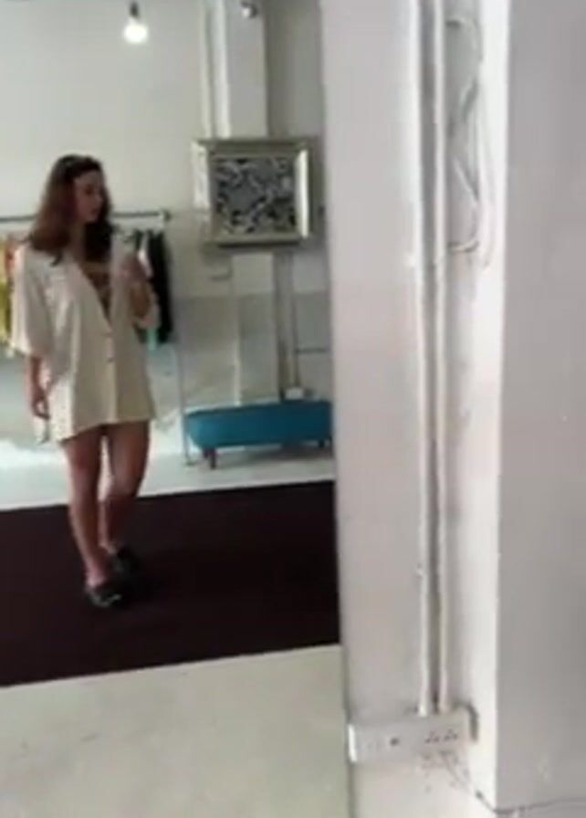 young woman looking in a mirror in what appears to be a retail space. She is wearing a loose white shirt and dark flats. Behind her is a clothing rack with items in various colors. A dark brown rug is on the floor. The camera pans to the right, showing a wall with handbags displayed on metal pipe racks. It then focuses on a checkout area with two women. One woman is standing behind a white counter with a plastic bag of items.