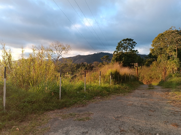 A sunlit dirt road winds through grassy terrain with fence posts marking its path. Mountains and a partly cloudy sky loom in the background. Vegetation thrives on either side of the road, with trees scattered throughout the landscape. Power lines stretch across the sky. The scene suggests a rural or countryside setting.