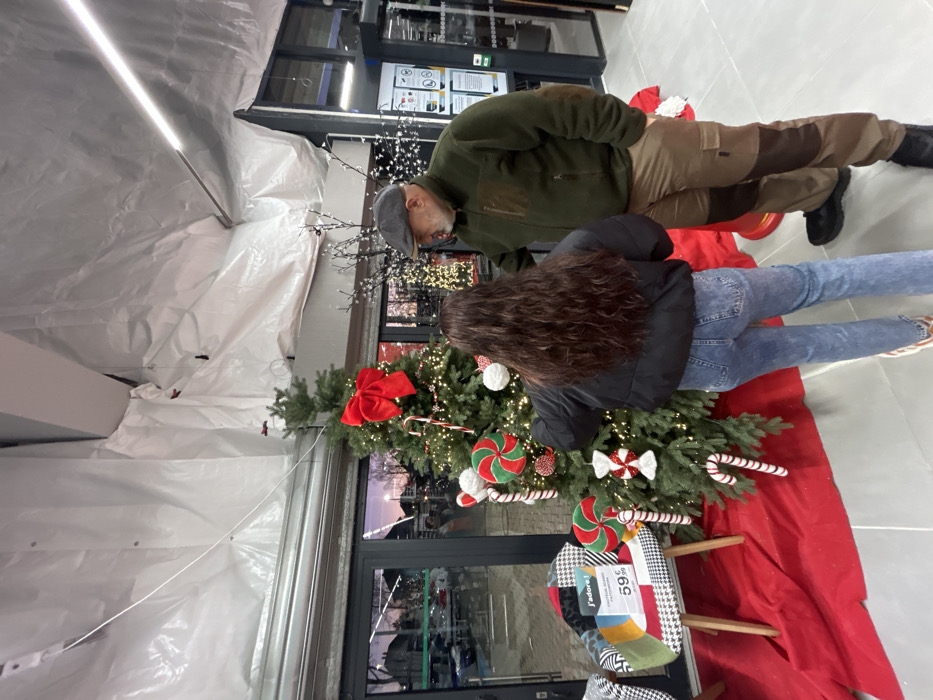An indoor scene in Oberhausbergen, France, depicts two individuals decorating an artificial Christmas tree