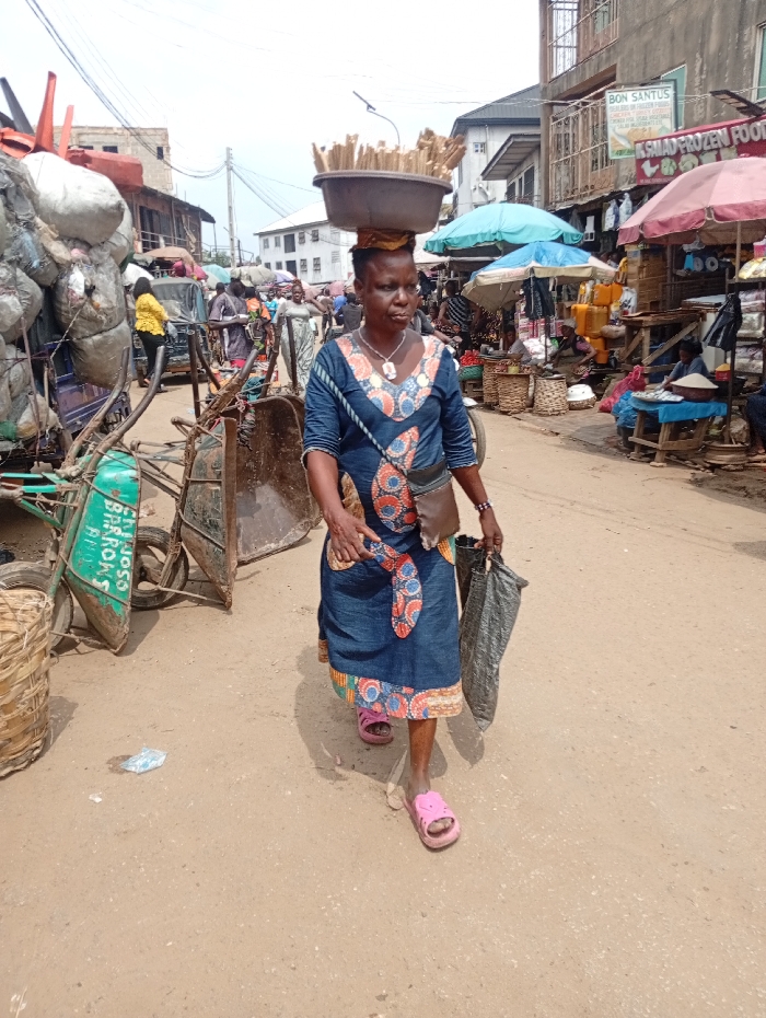 A woman walks down a bustling street carrying goods on her head in a shallow bowl. She wears a patterned dress and pink sandals, clutching a bag in her hand. The background reveals a crowded outdoor market with various stalls, vendors, and people passing by. A small cart laden with sacks sits to her left. The scene captures everyday life in an urban setting, with building facades and overhead wires adding to the busy atmosphere.