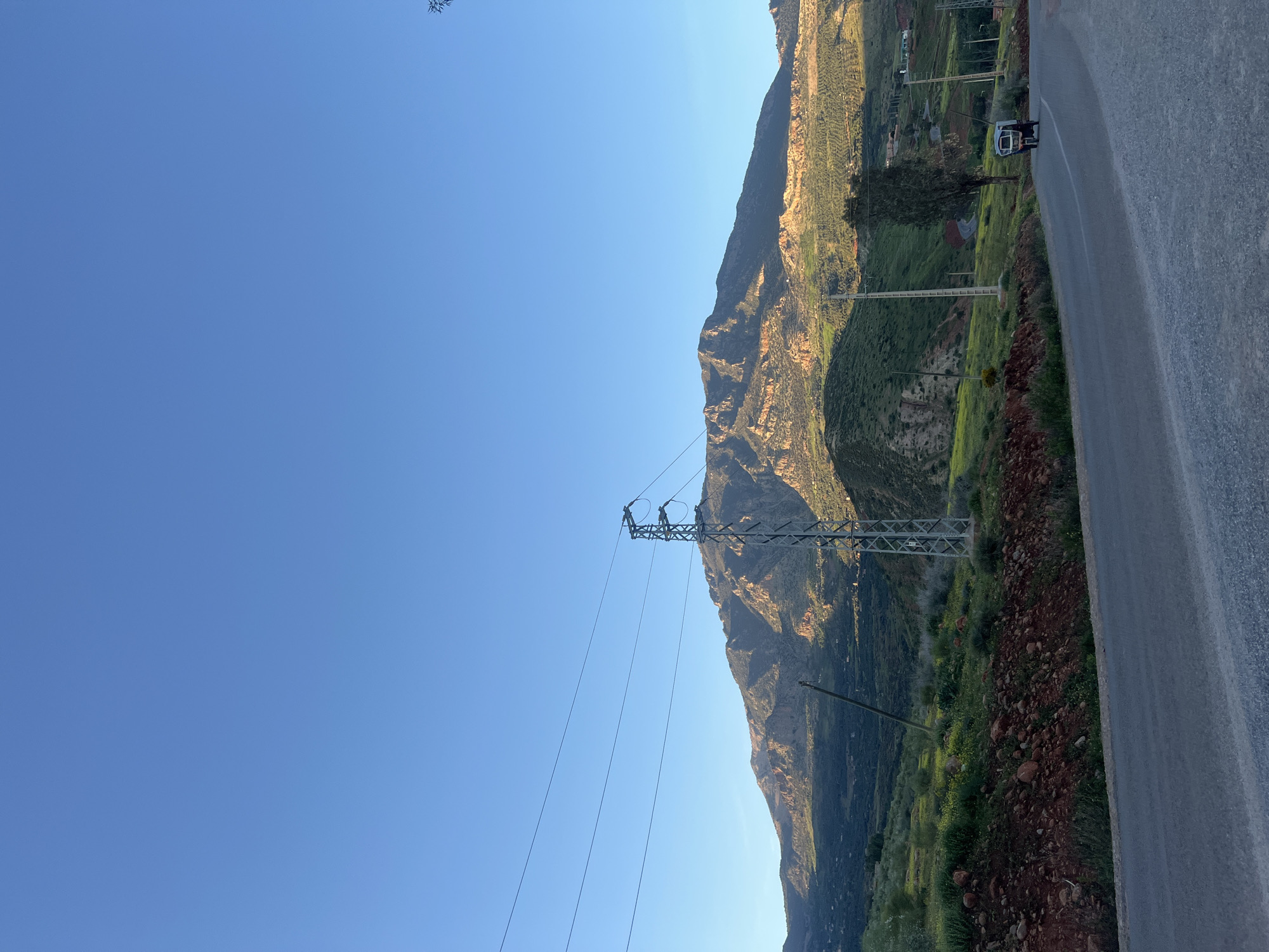 A mountain range climbs from the lower right to the upper center of the image. An electrical transmission tower stands in front of the mountains. A road runs along the right side, with a vehicle parked on it. Power lines stretch from the tower into the distance. The sky is a clear, bright blue. Green vegetation is visible along the mountain slopes.