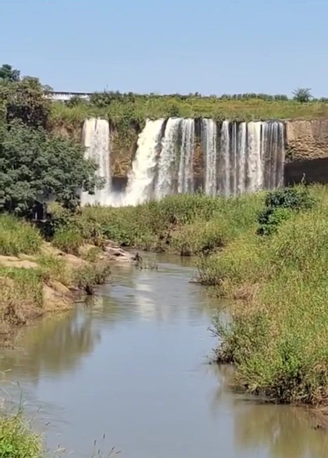 The scene is a daytime shot of a waterfall emptying into a river. The waterfall appears wide, with water cascading in multiple streams from the top. The river flows from the base of the waterfall towards the camera. Lush green vegetation lines the banks of the river, contrasting with the brown soil. Two individuals appear in the middle of the river. A building is faintly visible in the distance above the waterfall. The sky is clear and blue.