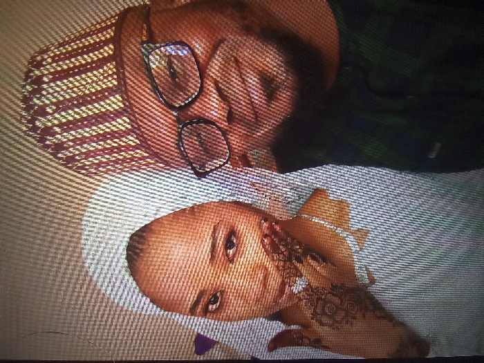 Two people are displayed. One wears a patterned cap and eyeglasses. The other has a henna tattoo on her hand and a white top. The background appears to be a white sheet.