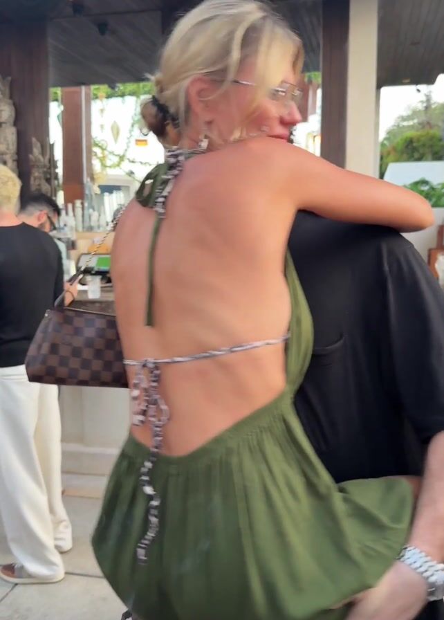 Here's a concise description of the video: The video shows a woman with blonde hair, wearing a green dress with an open back, being carried by a man in a black shirt. The woman is smiling and appears happy. The man has short, curly hair and is wearing glasses and a watch. They are in a public area, possibly a bar or restaurant, with other people visible in the background. There is a bar area with glasses behind them. The woman is carrying a purse. The lighting suggests it's daytime or early evening.