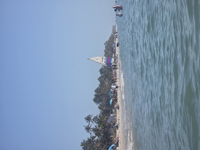 The image depicts a crowded beach scene on a clear, sunny day in Naples, United States of America. The foreground features light blue-green ocean water with visible ripples, where several individuals are partially submerged, standing waist to chest deep. A sandy beach occupies the midground, populated by numerous people engaged in walking, standing, and relaxing. Multiple beach umbrellas, primarily blue and white, are set up along the shore. A white sailboat with a purple and blue striped sail is positioned near the water's edge. The background consists of a dense line of palm trees bordering the beach, extending horizontally across the frame. The sky above is uniformly clear and bright blue.