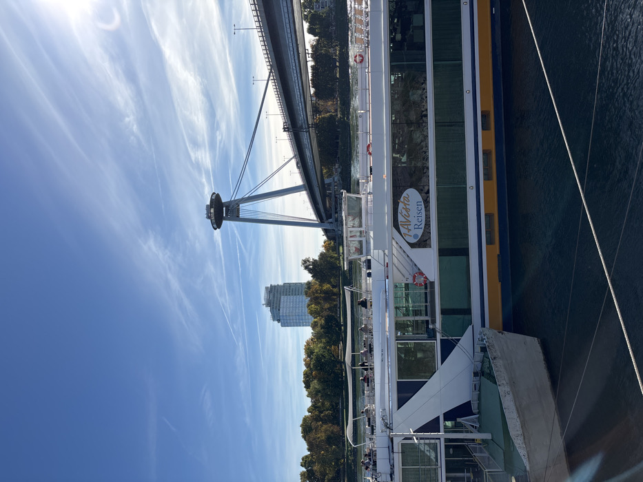 - "The image depicts a docked river cruise ship on the Danube River in Bratislava, Slovakia, with the Most SNP (UFO Bridge) prominently featured in the background under a clear blue sky" by FM-dNm8j2, licensed under CC BY 4.0