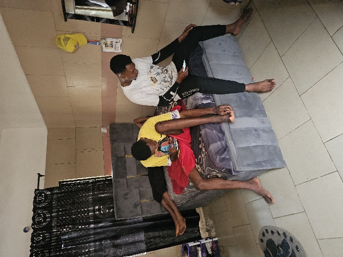The scene depicts an interior room in Ihiagwa, Nigeria, functioning as a bedroom or shared living space