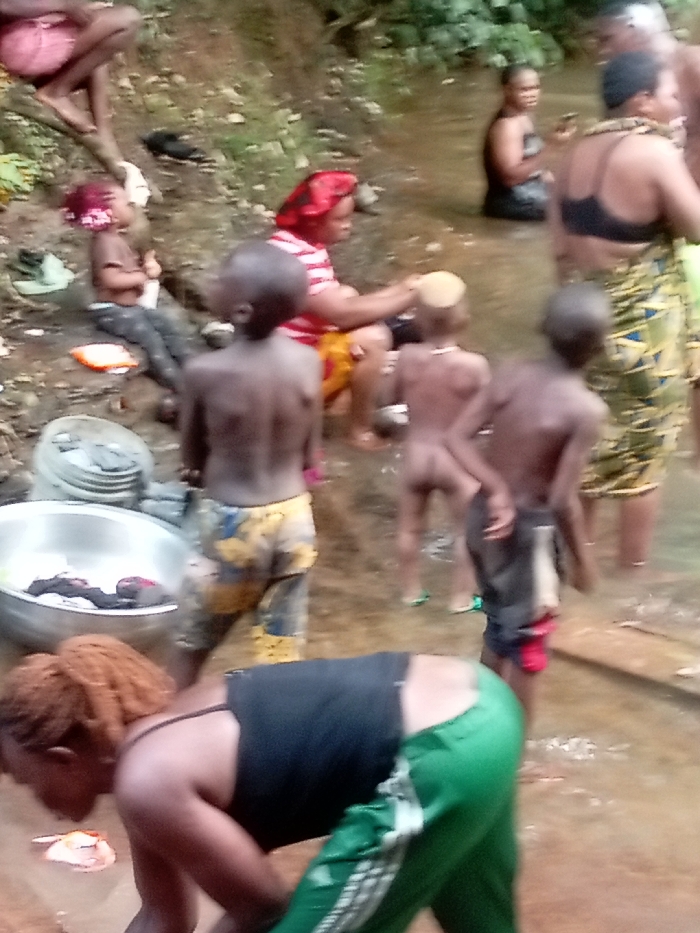 The image depicts a communal bathing and washing scene in a natural, outdoor environment within the city of Igbenu, Nigeria