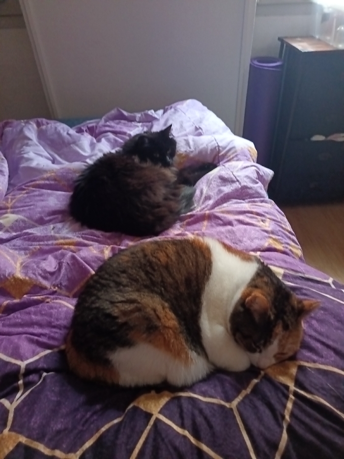 Two cats rest on a purple geometric-patterned bedspread. A black cat sits upright toward the back of the bed. In the foreground, a calico cat is curled up, its head tucked down. A white door is visible in the background, along with a purple yoga mat and dark wooden cabinet. The room is brightly lit, with a window in the upper right corner.