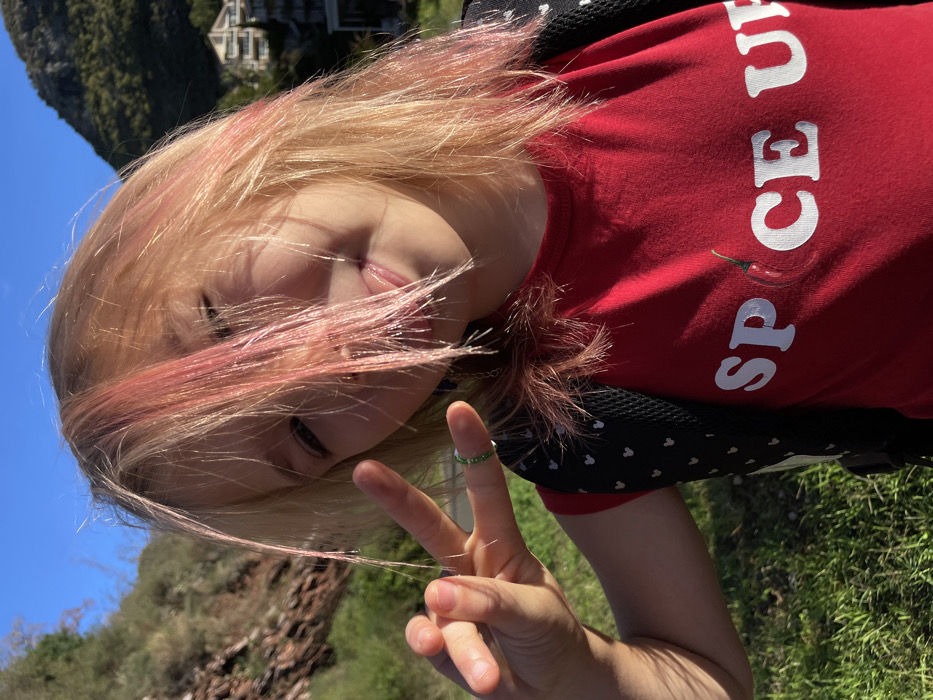 A young girl with blonde and pink-streaked hair poses outside, displaying a peace sign