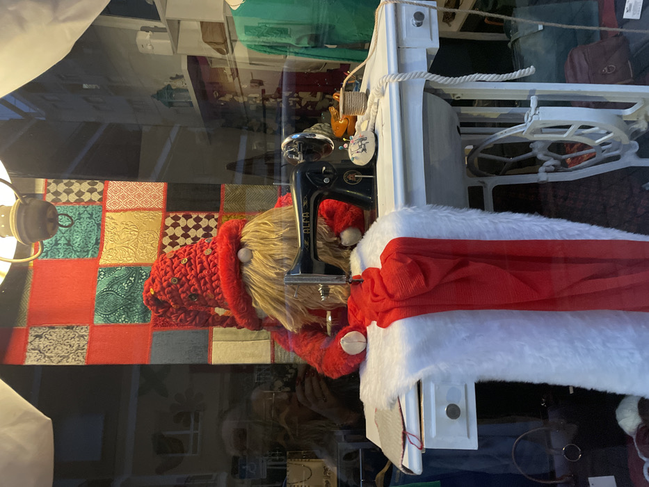 An antique sewing machine displays a Santa Claus figure. The Santa is dressed in red and white, positioned as if sewing on a quilt patch. The machine itself is white and black, with a visible wheel and intricate details. The quilt patch consists of squares of different colors and patterns. The scene is viewed through a window, with reflections visible on the glass.