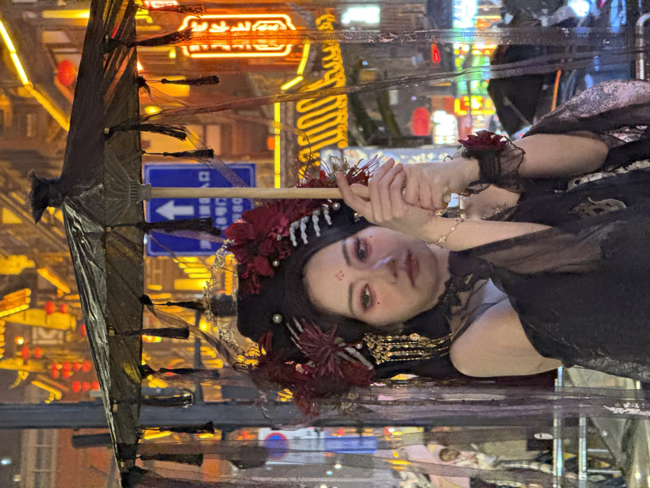 A female individual is depicted at night in what appears to be Hongyadong Commercial Street, Yuzhong District, Chongqing, China. She is positioned centrally, gazing directly forward with a neutral expression. Her hair is dark and styled upward, adorned with an elaborate headdress featuring red floral elements, white pearl-like beads, gold dangling ornaments, and white stylized bone-like structures. Her face exhibits distinctive makeup, including red eyeshadow, small red dots beneath her eyes, and a small red mark on her forehead. She is wearing a black, sheer, layered garment with lace detailing, possibly off-shoulder. A red floral cuff is visible on her right wrist, and a delicate bracelet on her left. Both hands are clasped around the light-colored wooden handle of a black, ornate umbrella. The umbrella features black tassels and sheer fabric drapes. In the background, illuminated traditional Chinese-style buildings with golden roofs and red lanterns are visible. A blue street sign with a white upward arrow and Chinese characters (partially obscured, appearing to indicate "entrance" and "80") is present. The scene is illuminated by artificial urban lighting, predominantly neon signs and streetlights, indicating a nighttime setting. No apparent interactions are occurring.