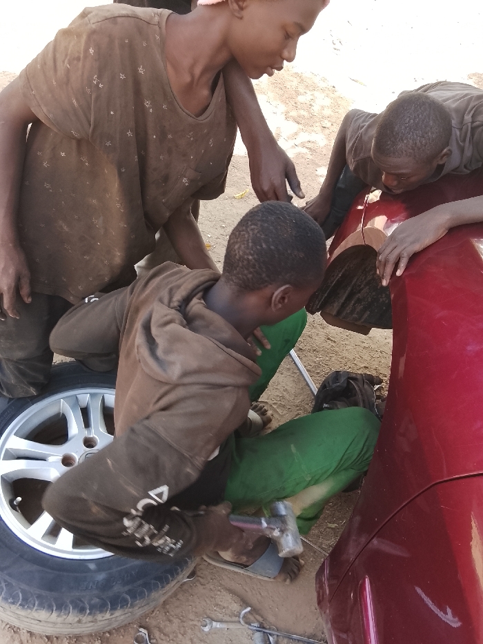 In an unpaved outdoor area in Jos, Nigeria, three young males are depicted engaged in vehicle repair