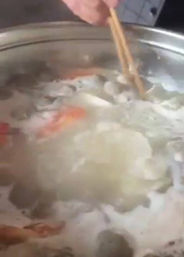 someone cooking in a kitchen. A person is adding ingredients to a large stainless-steel pot of boiling water. The ingredients include round meatballs, slices of a white vegetable, and pieces of what appears to be cooked seafood, possibly crab or lobster due to its red color. The person is using chopsticks to move the food around in the pot. The pot is steaming, indicating the high temperature of the water. The surrounding environment suggests a domestic kitchen setting.