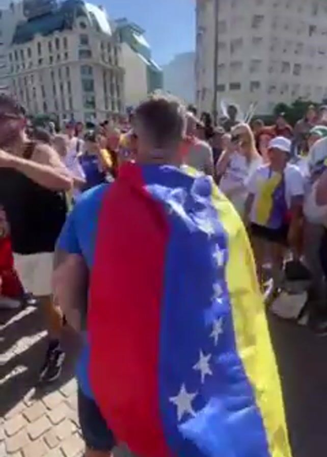 crowded public celebration. A man with a Venezuelan flag draped over his shoulders dances energetically in the center of a group. A woman in a pink top and jeans dances along with him. Other people are visible around them, some with Venezuelan flags and hats. The event appears to be taking place in a city square with buildings visible in the background and a blue sky.