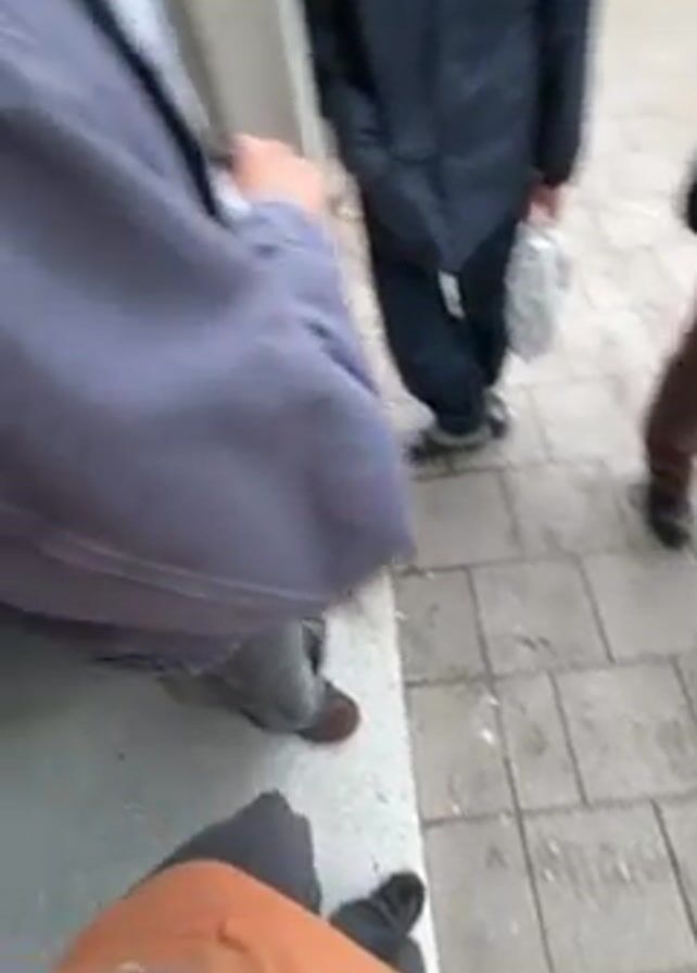 person opening a door to a clothing store. Outside, a group of people are standing on a tiled sidewalk. One person is holding a white plastic bag. Inside the store, there are racks of clothing, including colorful t-shirts. There are also large plastic bags filled with clothes, and a staircase leading to a loft area. The store appears somewhat cluttered.
