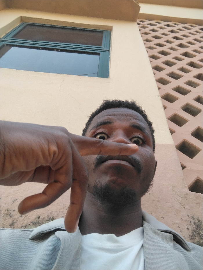 An African man takes a selfie with a light gray jacket and white t-shirt, with his finger pointing towards his nose. He stands near a building with tan stucco, a small window, and square brick latticework. The man has short hair and a dark beard. He faces the camera with wide eyes. The sunlight indicates it is probably taken outdoors during the day.