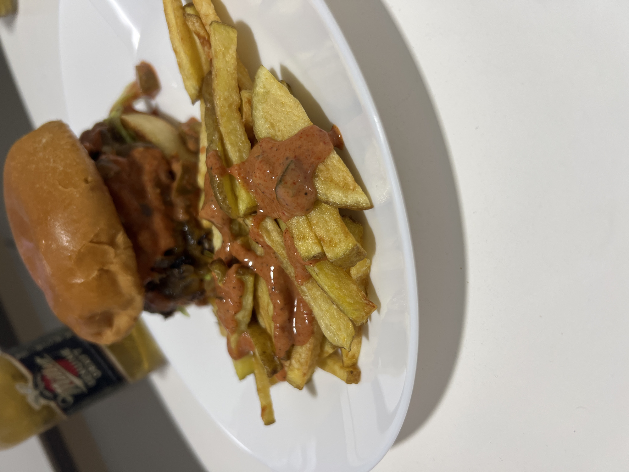 - "white plate with a sandwich or burger and french fries" by FM-33L543, licensed under CC BY 4.0