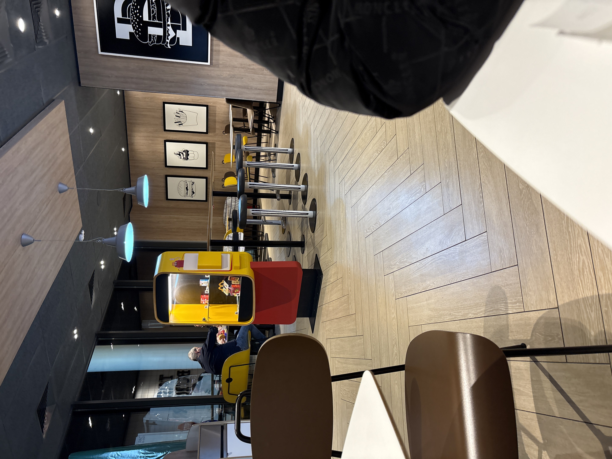 This image depicts the interior of a McDonald's restaurant located in Chuchuligovo, Bulgaria. The scene shows a modern dining area with a light wood-look tiled floor arranged in a herringbone pattern. The walls feature light wood paneling, adorned with three framed black-and-white graphic prints depicting a burger, an ice cream cone, and french fries. A large black-and-white graphic of a burger is visible on the far right wall. The ceiling is dark grey/black with recessed lighting and exposed ventilation, with a section of light wood paneling on the right. Several pendant lights with light blue shades hang from the ceiling. In the mid-ground, a prominent yellow and red kiosk-like structure, likely a display cabinet or self-order station, contains small items in clear compartments. Various tables and chairs are arranged throughout the space. Several high-top tables with black bases and light tops are accompanied by black-and-white striped bar stools. One male individual, wearing a dark jacket or shirt and blue jeans, is seated at a table on the left, facing away from the camera, appearing to be eating or observing the table surface. Other tables with yellow chairs are visible further back. In the immediate foreground, a brown chair with a black frame and a white table surface are partially visible and out of focus. A blurred dark fabric, possibly a jacket, is also visible on the far right, suggesting the perspective of a seated person. Large windows or glass panels are visible on the far left, offering a glimpse of an exterior or adjacent area.