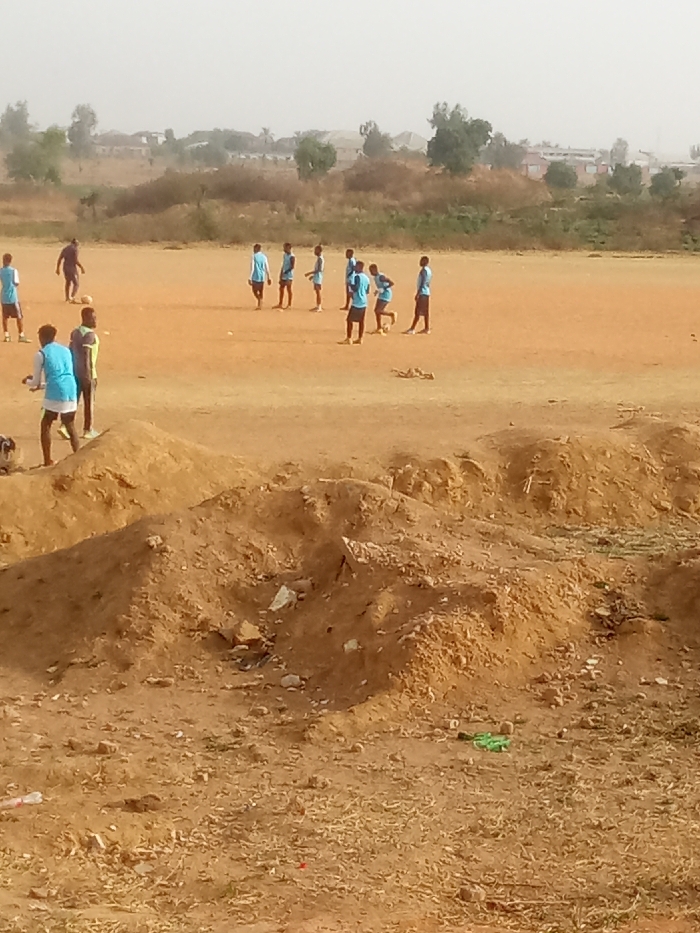 A group of young men in blue jerseys are practicing on a dirt soccer field. They are scattered across the field, with one individual dribbling a ball. The foreground is characterized by mounds of dirt and scattered debris. In the background, there are sparse trees, buildings, and a hazy sky.