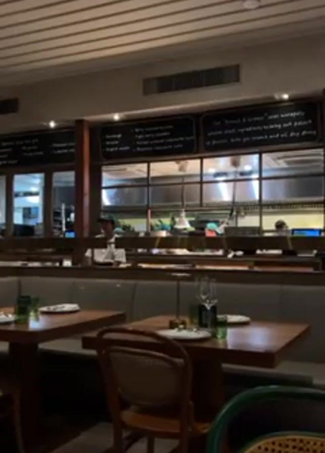 interior of a restaurant with a visible kitchen