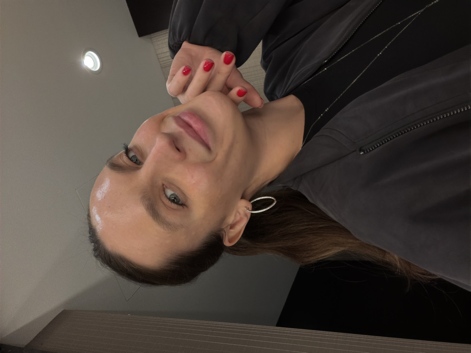 A woman with light skin, green eyes, and red nails poses, resting her head on her hand. She has brown hair and wears an oval earring. She is wearing a black top underneath a black jacket. A silver necklace hangs around her neck. In the background, a light fixture is visible. The photo has been rotated to the left.