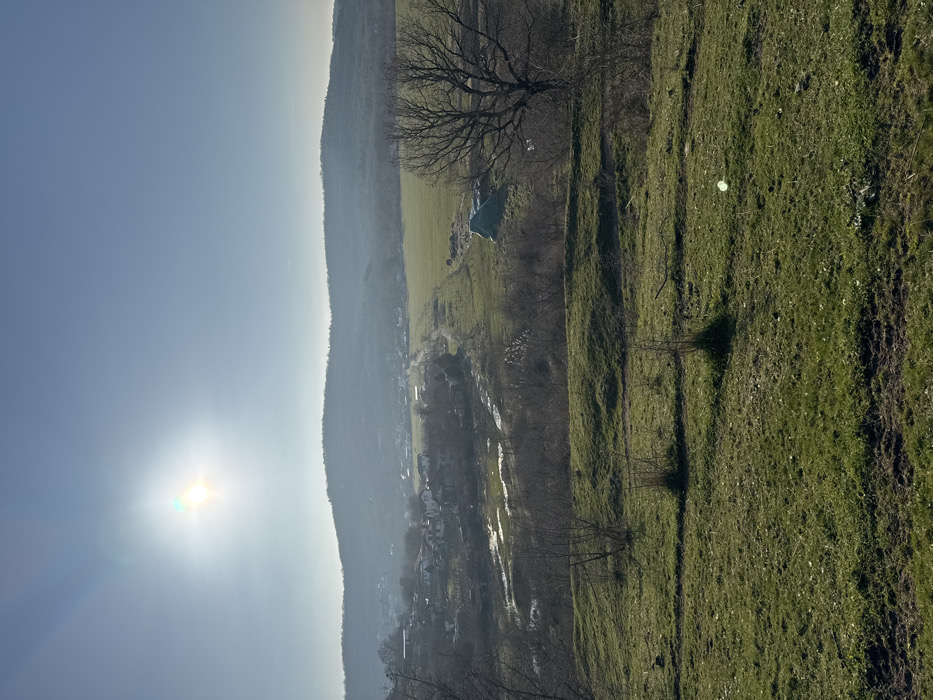 The image depicts an elevated panoramic landscape view over the city of Atiya, Bulgaria, under a bright sun. The foreground consists of a grassy hillside with undulating terrain, showing patches of worn earth and sparse, dry vegetation. In the midground, the valley floor reveals a cluster of residential buildings, characteristic of the city of Atiya, interspersed with bare deciduous trees and areas of ground appearing wet or marshy with standing water. A dirt path or road traverses the valley, running parallel to an open green field on the right. Within this field, a single structure covered by a blue-green tarp is visible. A large, bare deciduous tree with a broad crown stands prominently on the right side of the midground, bordering the field. The background features a range of hazy, forested hills or mountains. The sky is clear light blue, with the sun brightly visible in the upper left quadrant, causing lens flare. No people are discernible in the scene.