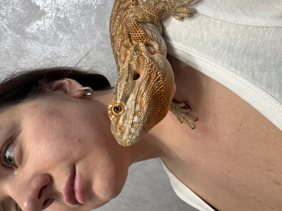 An indoor scene, presumably in Yakhroma, Russia, features a young adult female with a bearded dragon lizard