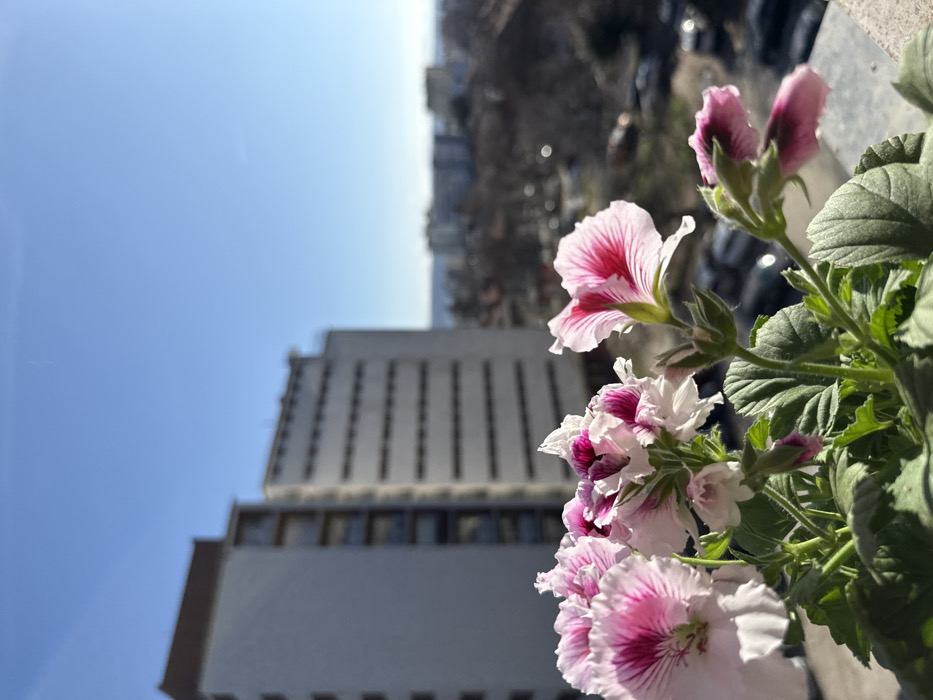 The image displays an elevated view over a cityscape in Varna, Bulgaria, under a clear blue sky with bright sunlight. In the immediate foreground, a potted plant features several light pink flowers with distinctive magenta stripes and green foliage, all rendered in sharp focus. The midground contains two out-of-focus, multi-story residential buildings characterized by light-colored facades and dark balcony structures. The building on the left has a reddish-brown roof. Beyond these buildings, the blurred panorama of Varna extends, showing dense urban development, numerous bare trees, and a visible parking area with parked vehicles. A large, indistinct blue body of water, consistent with the Black Sea or Varna Lake, is discernible on the distant horizon. No people are visible within the frame.