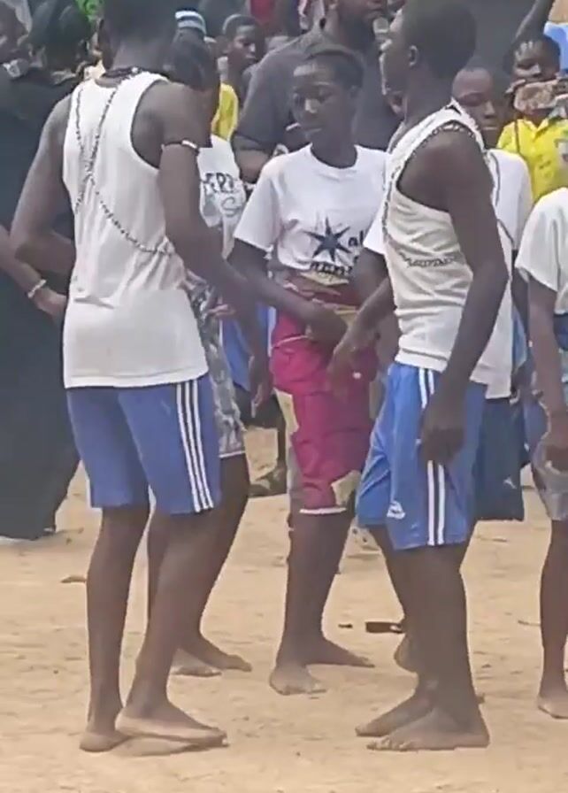 A group of young people are dancing in a circle on a sandy ground, barefoot